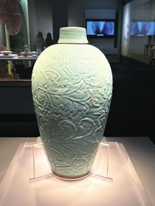 景德镇窑青白釉缠枝花卉纹带盖瓷梅瓶。