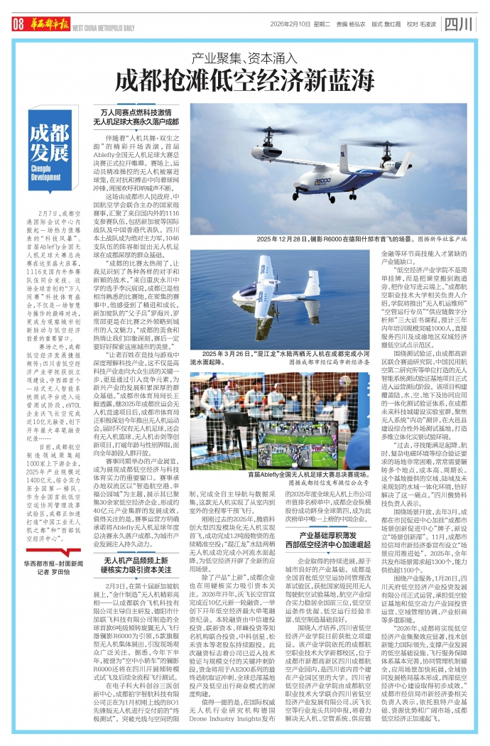 赛场之外,成都低空经济发展捷报频传:四川省低空经济产业学院获批立项建设,中西部首个一站式无人智能系统测试平台进入运营测试阶段,eVTOL企业沃飞长空完成近10亿元融资,创下开年最大单笔融资纪录……