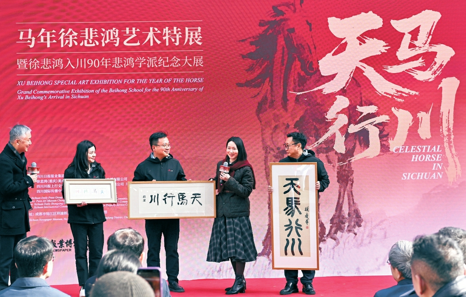 马年看马,天马行川。在中国现当代艺术史上,徐悲鸿笔下的“马”早已超越画作本身,成为昂扬奋进的民族图腾。2月10日下午,“天马行川——马年徐悲鸿艺术特展暨徐悲鸿入川90年悲鸿学派纪念大展”在四川报业博物馆开幕。在为期半年的展期中,徐悲鸿的24件真迹原作及18件“悲鸿学派”精品画作将在此集中展出。其中,《十二生肖册》《九方皋》《故园之猫》等徐悲鸿经典作品悉数亮相,更有罕见“奔马”系列作品首次在国内公开展出。