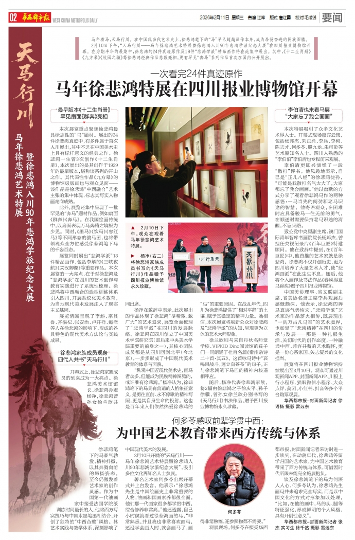 中国美协理事、省文联副主席、省美协名誉主席李兵观展后感慨颇深。他表示,徐悲鸿的奔马真迹气势恢宏,“悲鸿学派”艺术家的作品薪火相传,既展现出“一洗万古凡马空”的艺术境界,也彰显了“悲鸿精神”在四川的传承与发展——那是一种扎根生活、关切时代的创作态度,一种融通中西、兼容并蓄的艺术胸怀,更是一份心系家国、矢志复兴的文化担当。