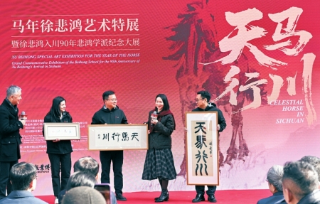 随后,杨净代表徐悲鸿家族,将3幅由徐悲鸿之子徐庆平、孙子徐骥、曾孙女徐兰欣分别书写的《天马行川》书法作品,赠予四川报业博物馆永久珍藏。