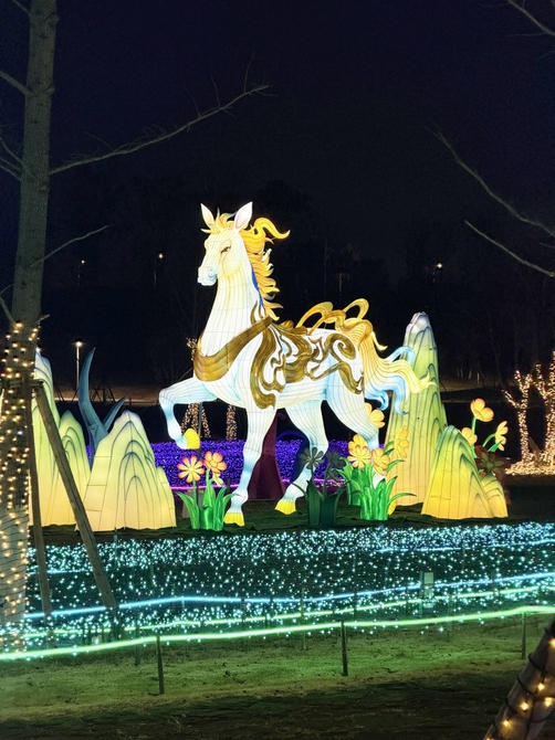 一进园区,红灯笼沿路排开,金色的麦浪灯高低错落,仿佛置身丰收的麦田。旁边,一匹骏马灯组昂首抬蹄,鬃毛与尾羽以渐变的黄、蓝、金三色呈现,仿佛在风中飞扬,动感十足。