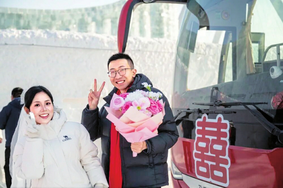 1月6日,在哈尔滨冰雪大世界园区,新人参加公益冰雪集体婚礼。 图据新华社客户端