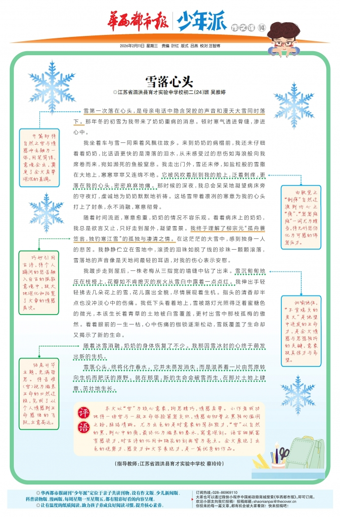 随着时间流逝,寒意愈重,奶奶的情况不容乐观。看着病床上的奶奶,我总是欲言又止,只好走到屋外,凝望雪景。我终于理解了柳宗元“孤舟蓑笠翁,独钓寒江雪”的孤独与凄清之情。在这茫茫的大雪中,感到独身一人的悲苦。我静静伫立在雪地中,滚烫的泪珠如脱了线的珍珠一颗颗滚落,雪落地的声音像是天地间最轻的耳语,对我的伤心表示安慰。