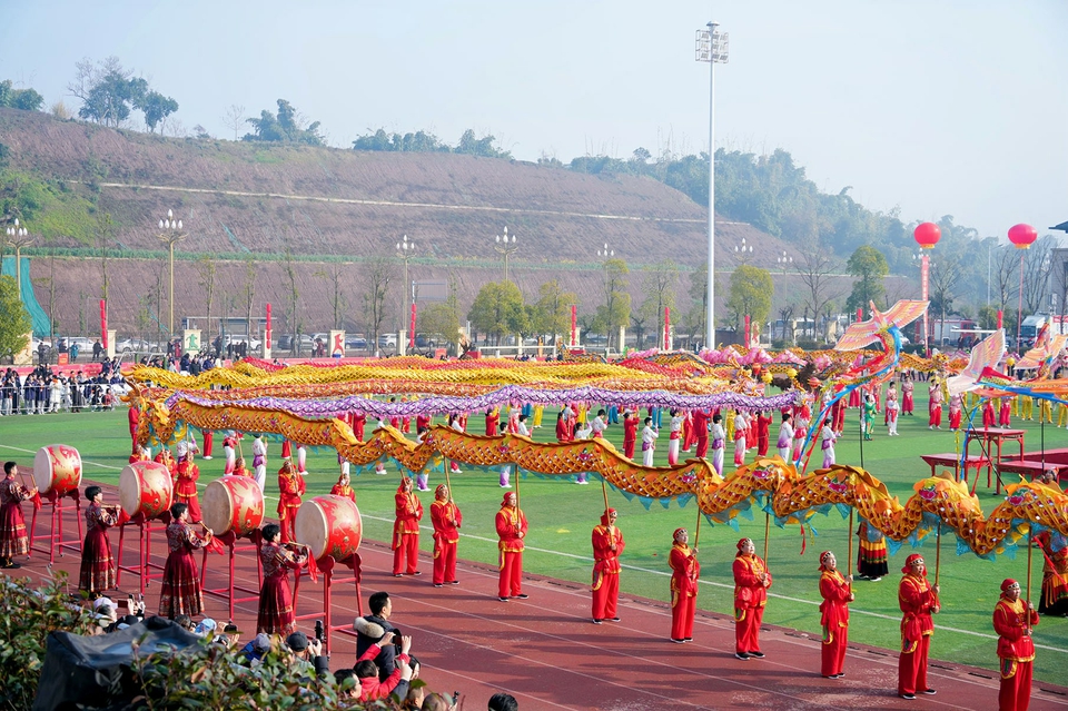 当天,来自全省20个市(州)的91支龙狮队伍、上千名演职人员齐聚富顺,与现场上万名市民游客共襄文旅盛宴、同贺新春佳节。活动不仅正式开启了全省2026年新春群众文化系列活动,更通过“非遗+展演+展销”的深度融合模式,为春节增添浓郁的巴风蜀韵与蓬勃的时代活力。