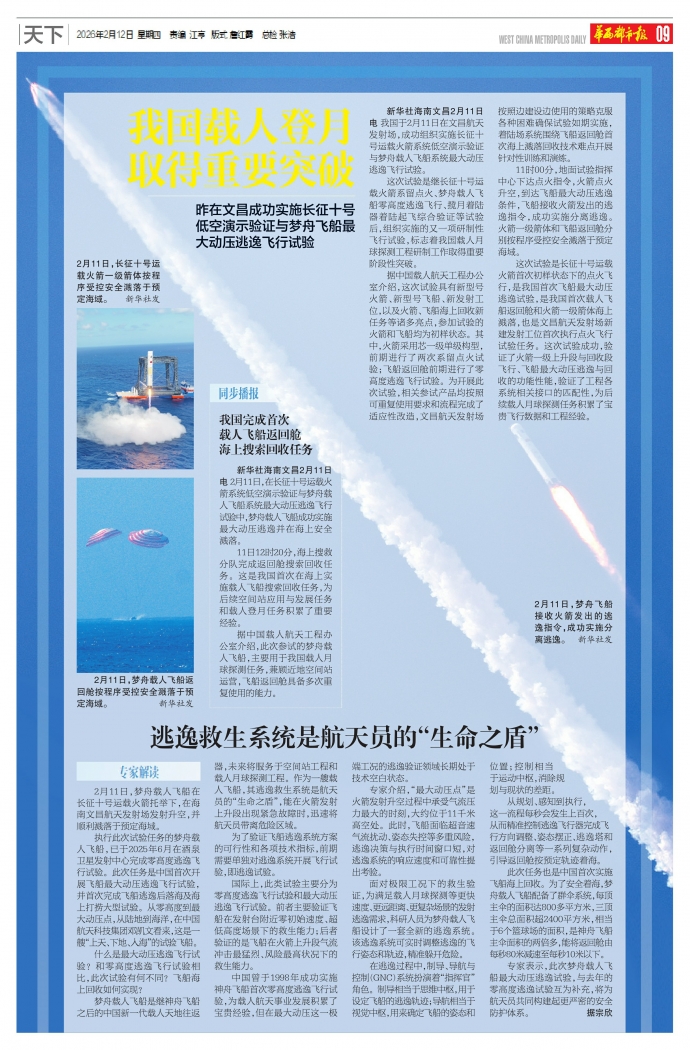 2月11日,梦舟载人飞船在长征十号运载火箭托举下,在海南文昌航天发射场发射升空,并顺利溅落于预定海域。