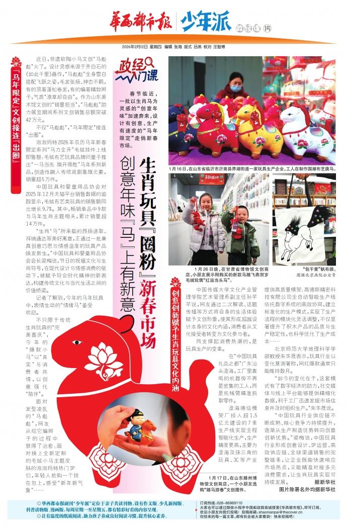 “生肖‘马’所承载的昂扬进取、祥瑞通达等美好寓意,正通过一批兼具创意巧思与情感温度的玩具产品焕发新生。”中国玩具和婴童用品协会会长梁梅说,节日的祝福文化与生肖符号,在现代设计与情感消费的驱动下,被赋予符合时代精神的新表达,构建传统文化与当代生活之间的价值桥梁。