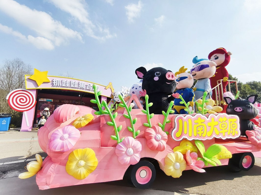 2026年农历新春将至,位于内江市市中区永安镇尚腾新村的川南大草原景区,年味儿已浓。2月11日,“万千气象看四川”主题采访团走进川南大草原。景区内,国民动漫IP“猪猪侠”与内江本土IP“内江黑猪”“永安白乌鱼”同台亮相,憨态可掬的形象标识融入景区各个场景,引得游客纷纷打卡拍照。