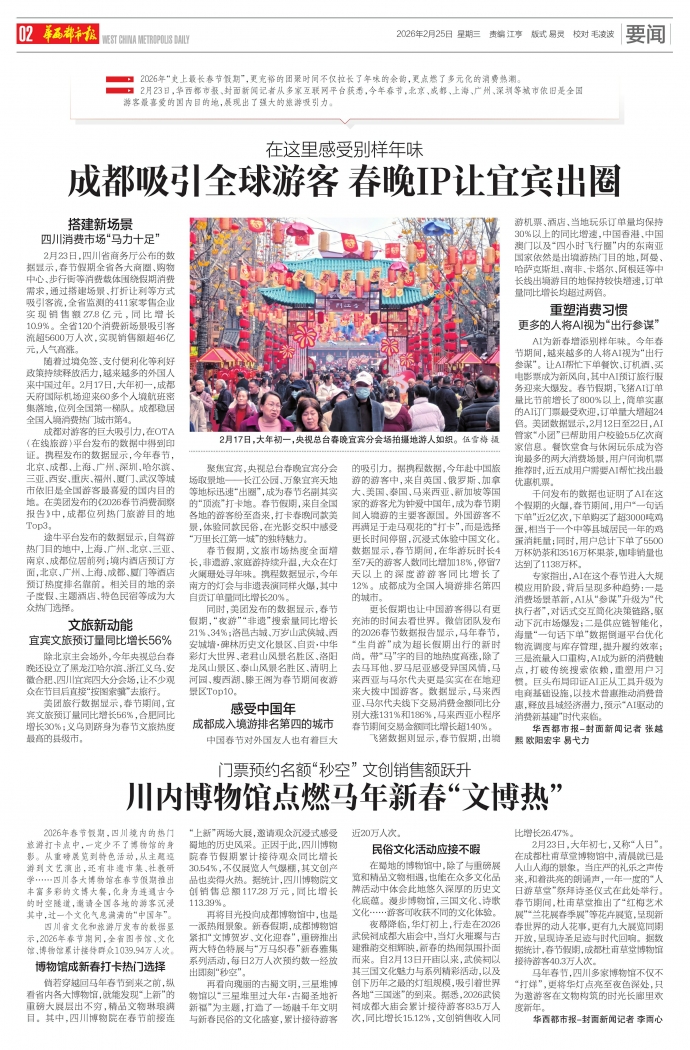 成都对游客的巨大吸引力,在OTA(在线旅游)平台发布的数据中得到印证。携程发布的数据显示,今年春节,北京、成都、上海、广州、深圳、哈尔滨、三亚、西安、重庆、福州、厦门、武汉等城市依旧是全国游客最喜爱的国内目的地。在美团发布的《2026春节消费洞察报告》中,成都位列热门旅游目的地Top3。