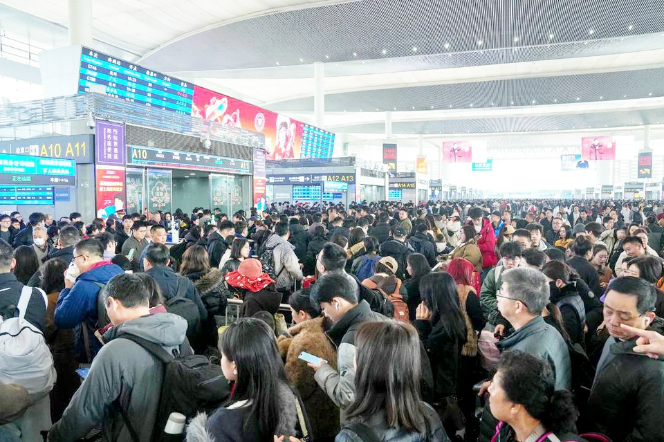 春节假期乘客在成都东站排队候车。费思童摄