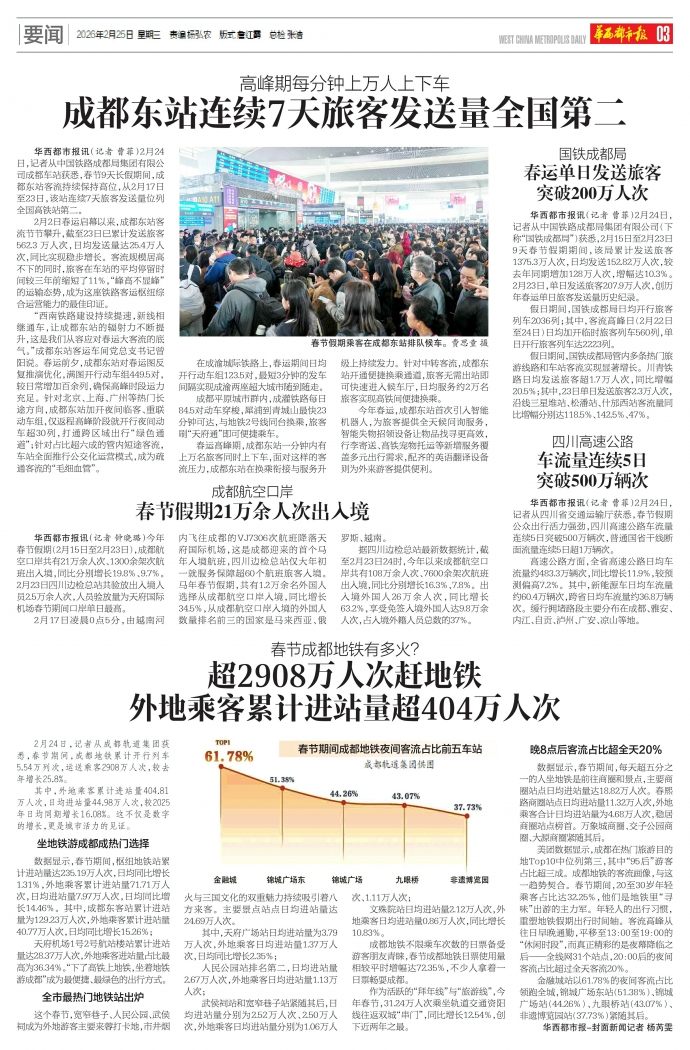 华西都市报讯(记者钟晓璐)今年春节假期(2月15日至2月23日),成都航空口岸共有21万余人次、1300余架次航班出入境,同比分别增长19.8%、9.7%。2月23日四川边检总站共验放出入境人员2.5万余人次,人员验放量为天府国际机场春节期间口岸单日最高。