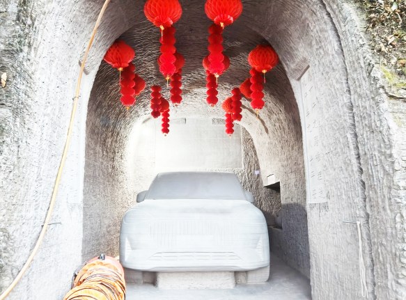 创作中他处处藏着巧思:为提升作品耐用性,未掏空汽车底盘;在洞口挖出排水沟防止渗水;对后视镜与车身的连接处做了加固处理。