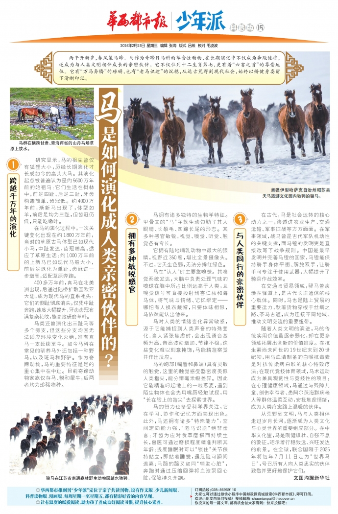丙午开新岁,春风策马蹄。马作为奇蹄目马科的草食性动物,在长期演化中不仅成为奔跑健将,还成为与人类文明相伴成长的亲密伙伴。它不仅位列十二生肖第七,更有着“六畜之首”的尊崇地位。它有“万马奔腾”的磅礴,也有“老马识途”的沉稳,从远古荒野到现代社会,始终以矫健身姿留下清晰印记。