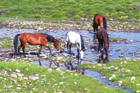 马群在横跨甘肃、青海两省的山丹马场草原上饮水。
