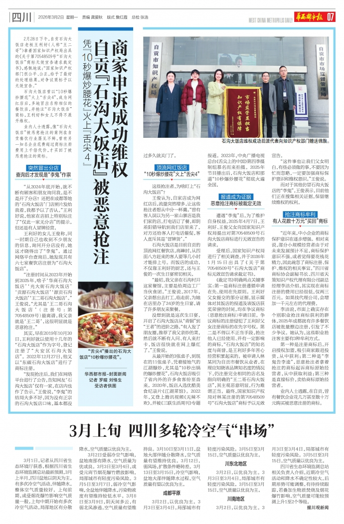 3月1日,记者从四川省生态环境厅获悉,根据四川省生态环境监测总站最新预测,3月上半月,四川盆地以阴天为主,有多次冷空气活动,伴随降水,整体空气质量较好。上旬前期,或受烟花爆竹影响空气质量一般,上旬中期开始有多次冷空气活动,局部地区有分散降水,空气质量以优良为主。