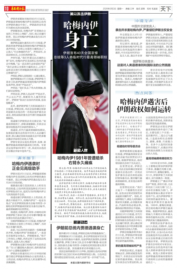伊朗总统佩泽希齐扬3月1日说,伊朗临时领导委员会当天开始工作,直至选举出新的最高领袖。