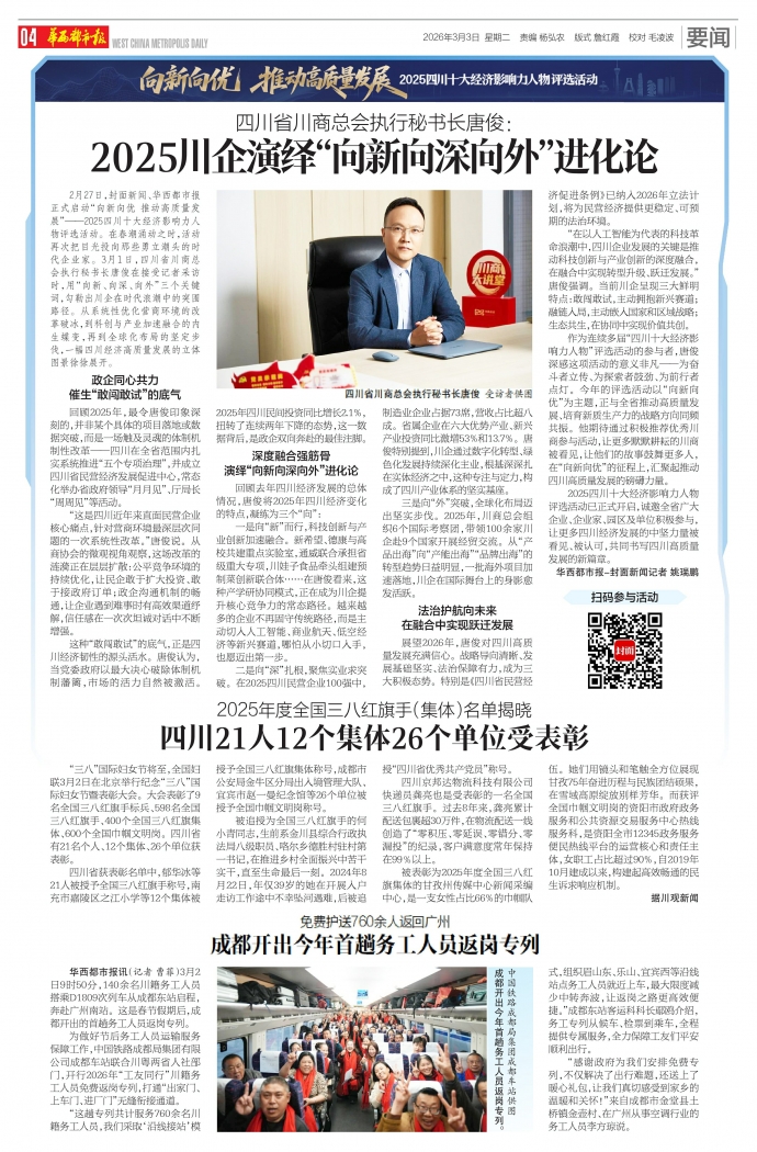 2月27日,封面新闻、华西都市报正式启动“向新向优 推动高质量发展”——2025四川十大经济影响力人物评选活动。在春潮涌动之时,活动再次把目光投向那些勇立潮头的时代企业家。3月1日,四川省川商总会执行秘书长唐俊在接受记者采访时,用“向新、向深、向外”三个关键词,勾勒出川企在时代浪潮中的突围路径。从系统性优化营商环境的改革破冰,到科创与产业加速融合的内生蝶变,再到全球化布局的坚定步伐,一幅四川经济高质量发展的立体图景徐徐展开。