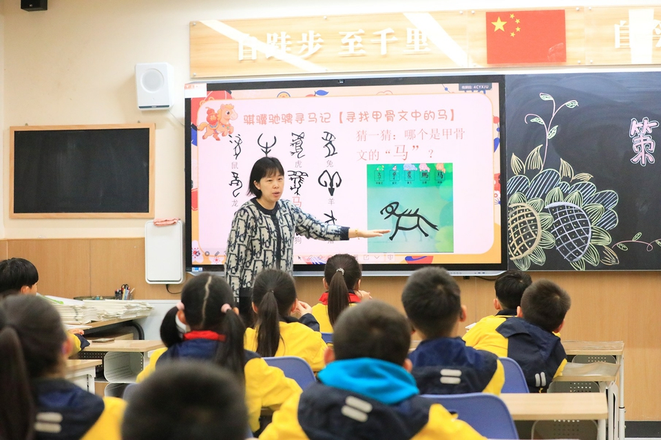 成都天府中学附属小学的老师正在给同学们讲解“马”字的演变过程。