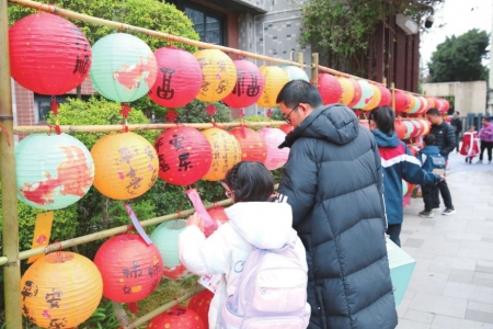 开学正值元宵佳节前夕,也有学校通过元宵节的传统文化活动,来营造开学别样的温馨与韵味。成都市石笋街小学校一品天下分校用红彤彤的灯笼装点校园,精心布置了非遗拓印、小马灯笼、醒狮灯笼打卡区……孩子们在欣赏和游玩中,与古老的非遗悄然相遇。在校园内,学生们还可以参与猜灯谜,体验投壶、套锦鲤、滚铁环、蹴鞠等传统游艺。