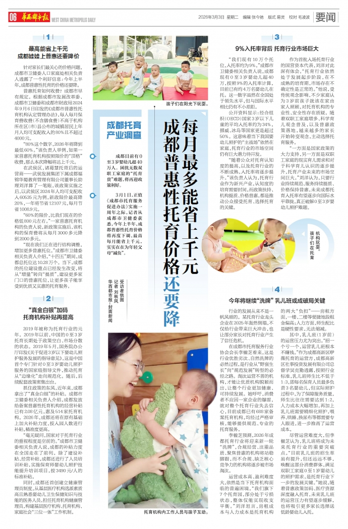 抓住政策的东风,近年来,成都拿出了“真金白银”的补贴。成都市卫健委相关负责人介绍,成都发放给备案普惠性托育机构的经营补贴已有2.08亿元,惠及514家托育机构。2026年,成都还将在原有基础上加大补贴力度,按入园人数进行补贴,精准度更高。