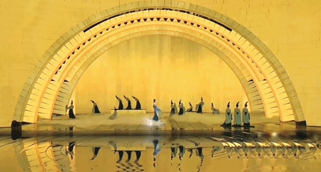 谈到登上春晚的现象级作品《只此青绿》,任冬生告诉记者,为了在舞台上还原这幅名作意境,团队设计了四层同心圆转台与空中三片弧形装置,共同构建出“卷轴”般的视觉核心。通过精准的数控系统,机械转台与演员的调度、灯光的色温变化实现了这种带有“呼吸感”的节奏性演绎。他特别强调,舞台上的光色摒弃了现代化学合成的纯色,转而追寻宋代绘画中独特的“设色”理念——那不仅只是眼睛看到的山水,更是画家心中的意象青绿。“每一帧画面都要像静止的古画,层层叠叠的光影与服装色调相互渗透,才能呈现出那种深邃的宋韵。”