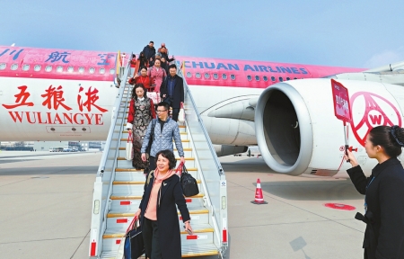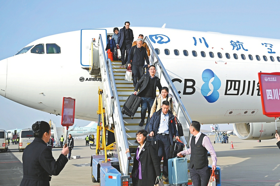 3月3日,出席全国政协十四届四次会议的四川省全国政协委员乘机抵达北京。 四川日报全媒体记者杨树摄