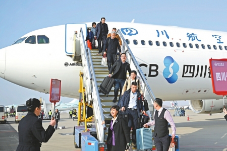 3月3日,出席十四届全国人大四次会议的四川代表团乘机抵达北京首都机场。 四川日报全媒体记者欧阳杰摄