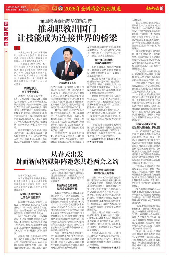 “我国56个民族都有全国政协委员。”刘结一介绍,全国政协充分发挥这一优势,积极开展促进各民族交往交流交融的“委员促三交”系列活动,深化各民族血脉相融、信念相同、文化相通、经济相依、情感相亲的共识。