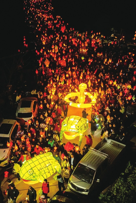 点点灯光有序汇聚,在乡村道路上蜿蜒穿梭。当队伍行至集中祈福点,大家按照传统习俗,将“大蛴蟆灯”焚烧,将“小蛴蟆灯”插入土中或投入河中。就在此时,震耳欲聋的鞭炮声再次响起,锣鼓也敲得更加欢快。