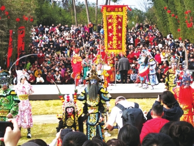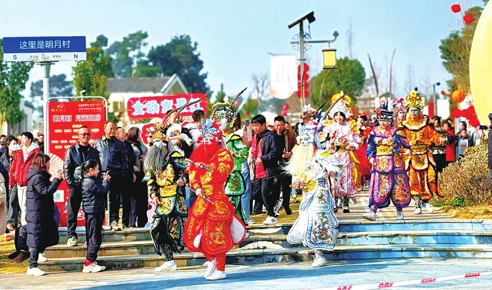 马年春节,英歌舞表演走进蒲江明月村。