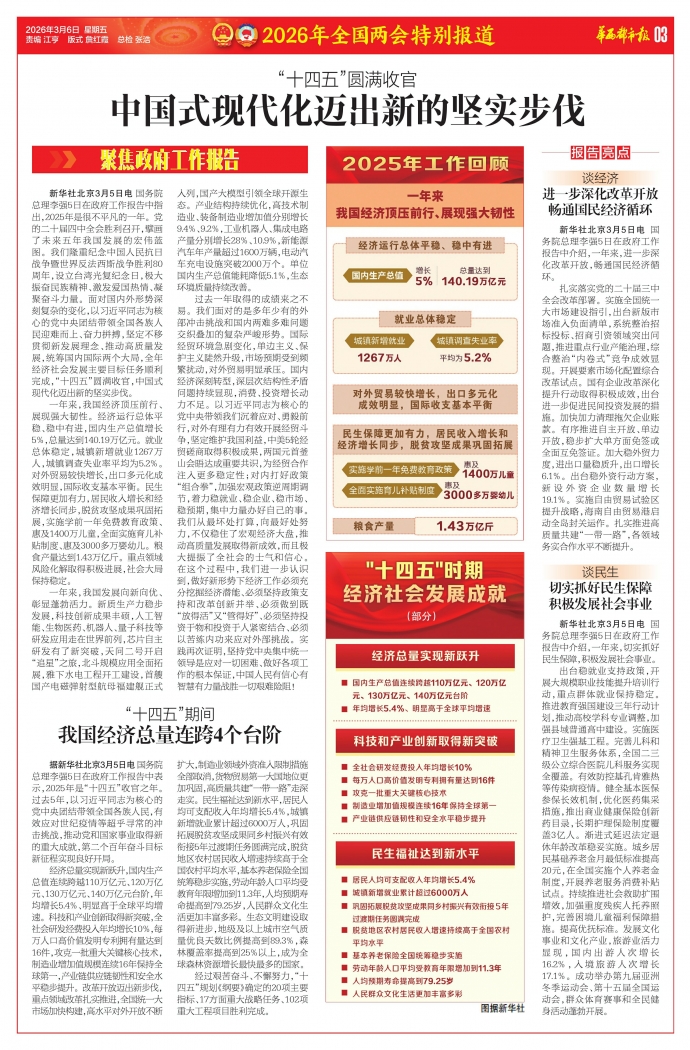 据新华社北京3月5日电 国务院总理李强5日在政府工作报告中表示,2025年是“十四五”收官之年。过去5年,以习近平同志为核心的党中央团结带领全国各族人民,有效应对世纪疫情等超乎寻常的冲击挑战,推动党和国家事业取得新的重大成就,第二个百年奋斗目标新征程实现良好开局。