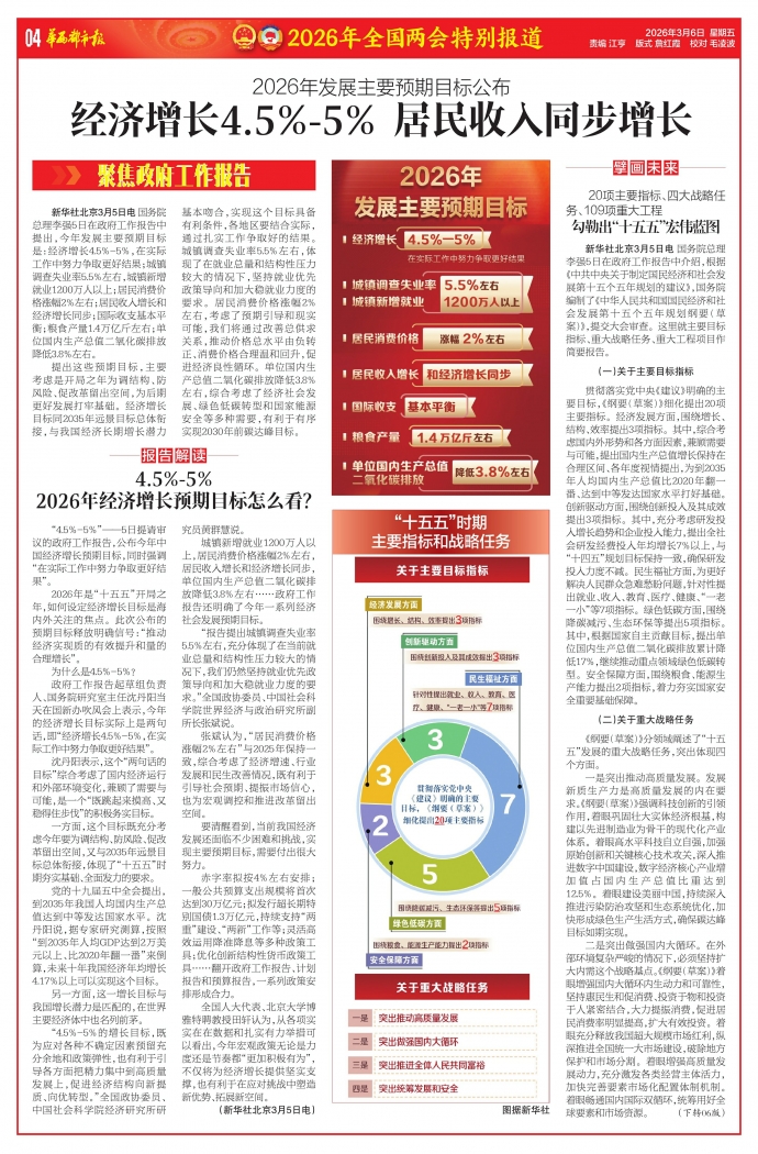 城镇新增就业1200万人以上,居民消费价格涨幅2%左右,居民收入增长和经济增长同步,单位国内生产总值二氧化碳排放降低3.8%左右……政府工作报告还明确了今年一系列经济社会发展预期目标。