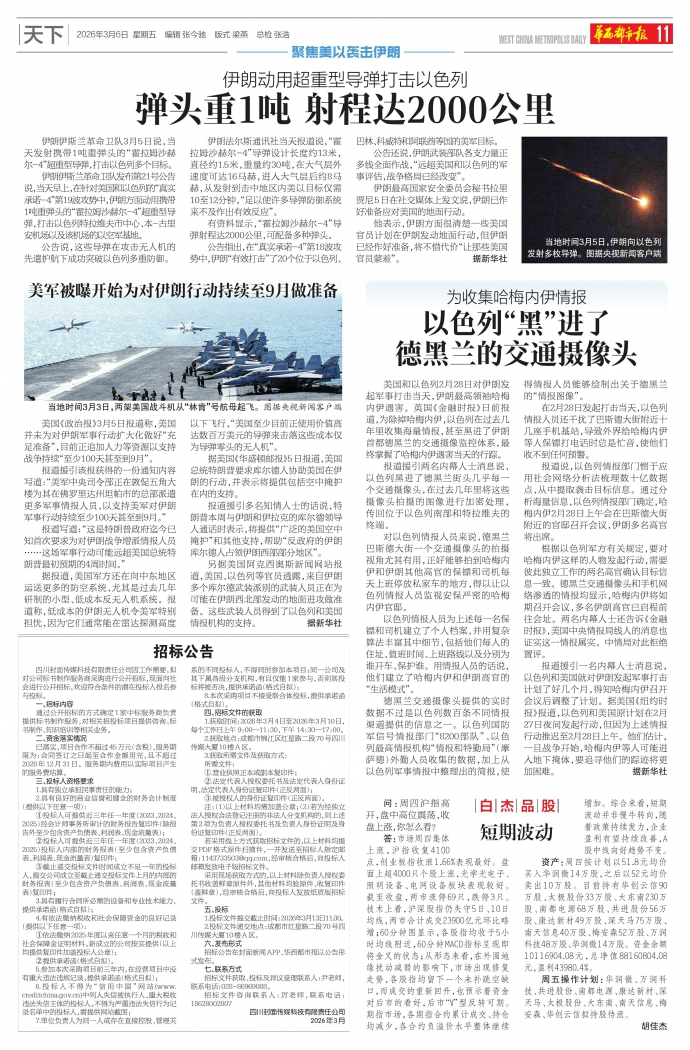 伊朗伊斯兰革命卫队3月5日说,当天发射携带1吨重弹头的“霍拉姆沙赫尔-4”超重型导弹,打击以色列多个目标。