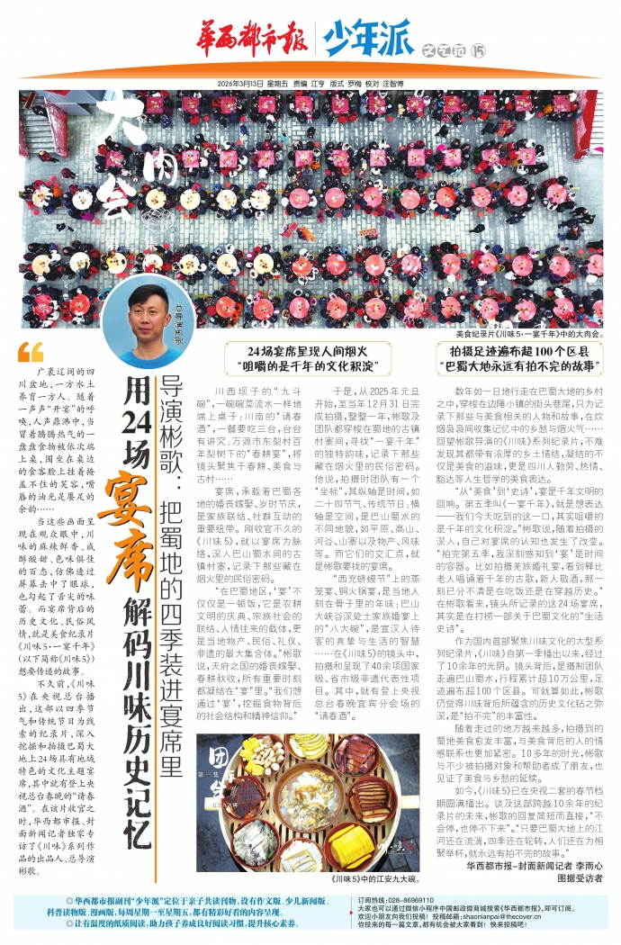 不久前,《川味5》在央视总台播出,这部以四季节气和传统节日为线索的纪录片,深入挖掘和拍摄巴蜀大地上24场具有地域特色的文化主题宴席,其中就有登上央视总台春晚的“请春酒”。在该片收官之时,华西都市报、封面新闻记者独家专访了《川味》系列作品的出品人、总导演彬歌。
