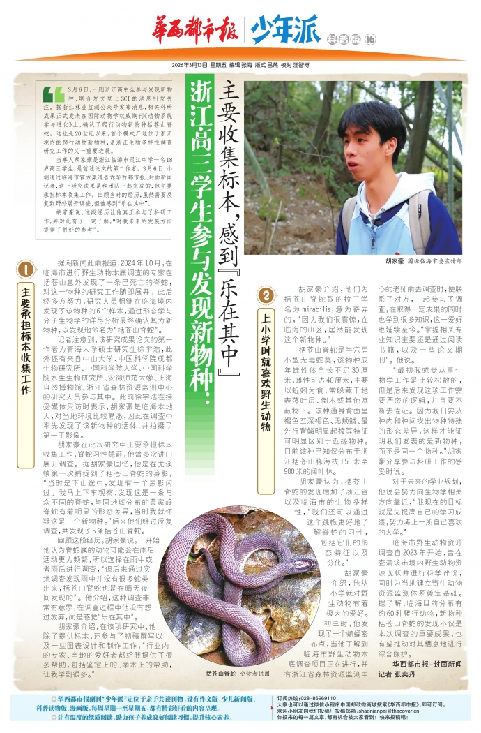 当事人胡家豪是浙江临海市灵江中学一名18岁高三学生,是前述论文的第二作者。3月6日,小胡通过临海市官方渠道告诉华西都市报、封面新闻记者,这一研究成果是和团队一起完成的,他主要承担标本收集工作。回顾当时的经历,虽然需要反复到野外展开调查,但他感到“乐在其中”。