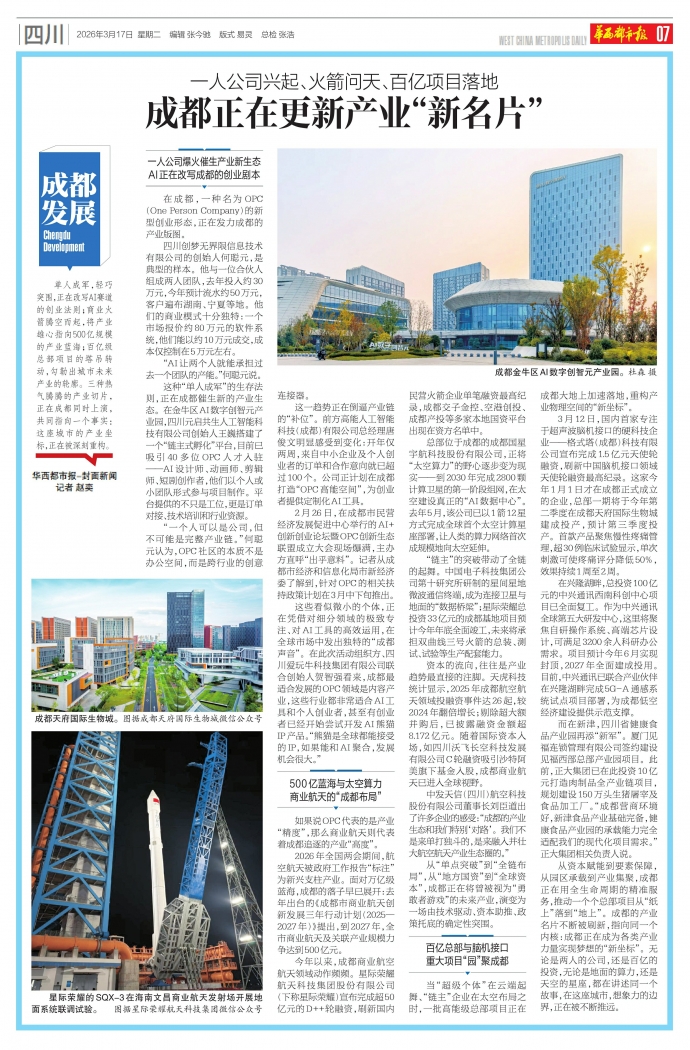 单人成军,轻巧突围,正在改写AI赛道的创业法则;商业火箭腾空而起,将产业雄心指向500亿规模的产业蓝海;百亿级总部项目的塔吊转动,勾勒出城市未来产业的轮廓。三种热气腾腾的产业切片,正在成都同时上演,共同指向一个事实:这座城市的产业坐标,正在被深刻重构。