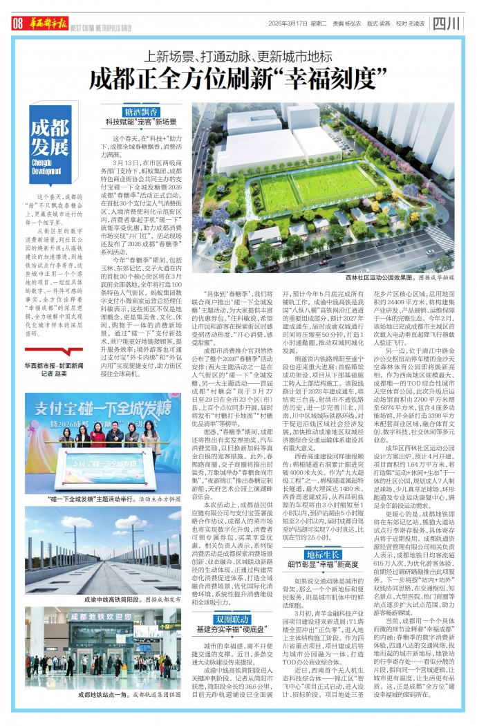 从街区里的数字消费新场景,到社区公园的焕新升级;从高铁建设的加速推进,到地铁站试点行李寄存,这座城市正用一个个落地的项目、一组组具体的数字、一件件可感的事实,全方位诠释着“幸福成都”的深层逻辑,全力破解中国式现代化城市样本的深层密码。