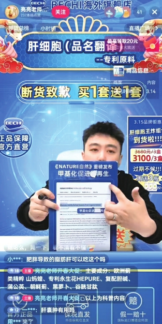 BECHI护肝产品在直播中声称,原材料中的法国永生花可以实现“DNA甲基化促进肝细胞再生”,研究成果发表在《自然》期刊。广告中更是以主播播报新闻的方式,以“欧洲黑科技攻克护肝难题”为标题宣传,称这项技术“摸清了肝细胞再生的底细”。