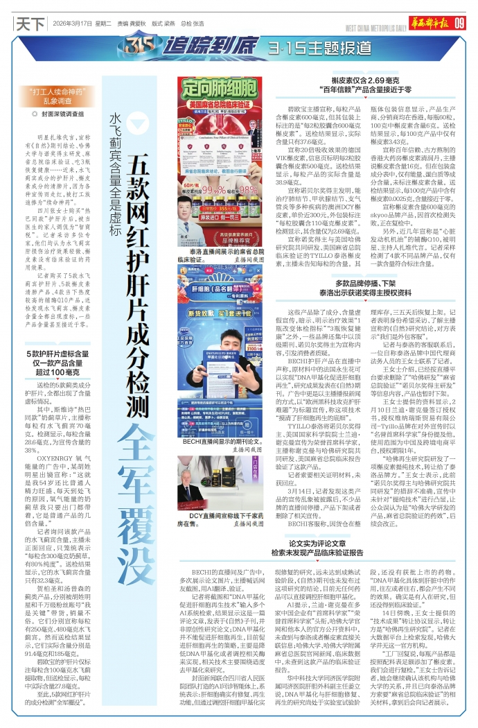 “工厂回复说,每瓶产品都是按照配料表足额添加了槲皮素。我们会进行复检。”王女士告诉记者,她会继续确认该机构与哈佛大学的关系,并且已向泰洛品牌方索要“麻省总院临床验证”的相关材料,拿到后会向记者展示。