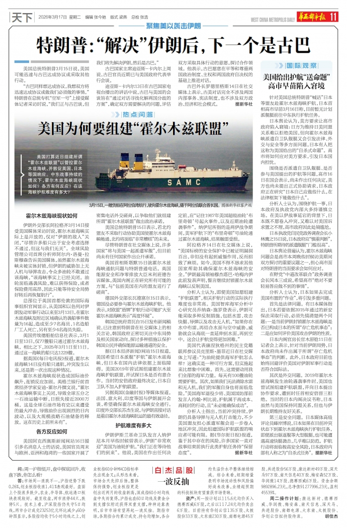 美国打算近日组建所谓“霍尔木兹联盟”以管控霍尔木兹海峡,并敦促英国、日本等国响应。中东战事持续的情况下,霍尔木兹海峡现状如何?各方有何反应?在该海峡护航难度有多大?