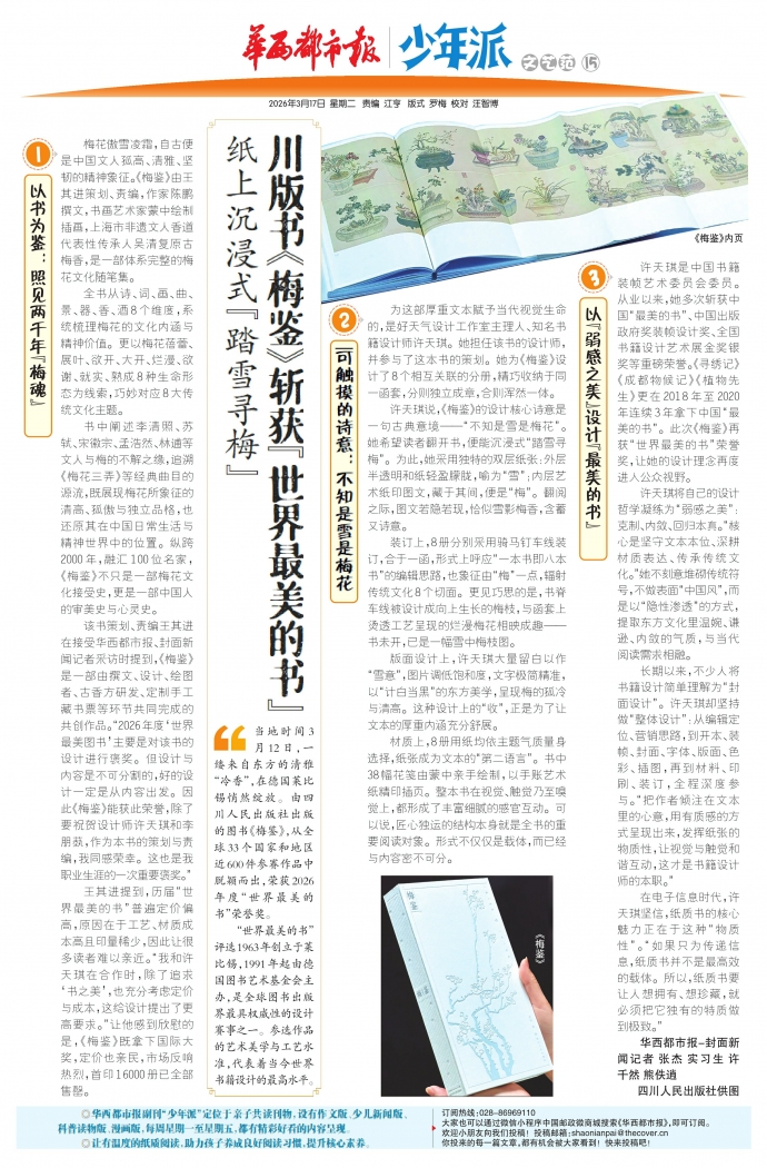 当地时间3月12日,一缕来自东方的清雅“冷香”,在德国莱比锡悄然绽放。由四川人民出版社出版的图书《梅鉴》,从全球33个国家和地区近600件参赛作品中脱颖而出,荣获2026年度“世界最美的书”荣誉奖。