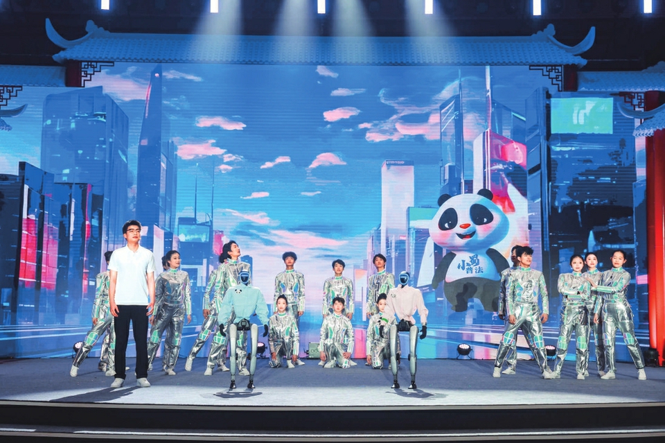 来自2035年的智能普法机器人“未央”和四川普法数字IP“小蜀”一同演绎“未来的法治”。 主办方供图
