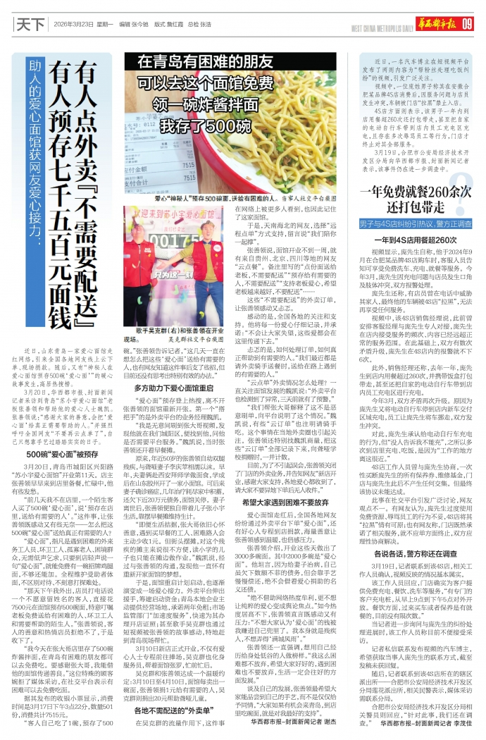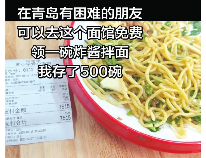 “我今天在张大哥店里存了500碗炸酱拌面,在青岛有困难的朋友都可以去免费吃。要感谢张大哥,我能借他的面馆传递善良。”这位特殊的顾客婉拒了媒体采访,在社交平台表示有困难可以去免费吃面。