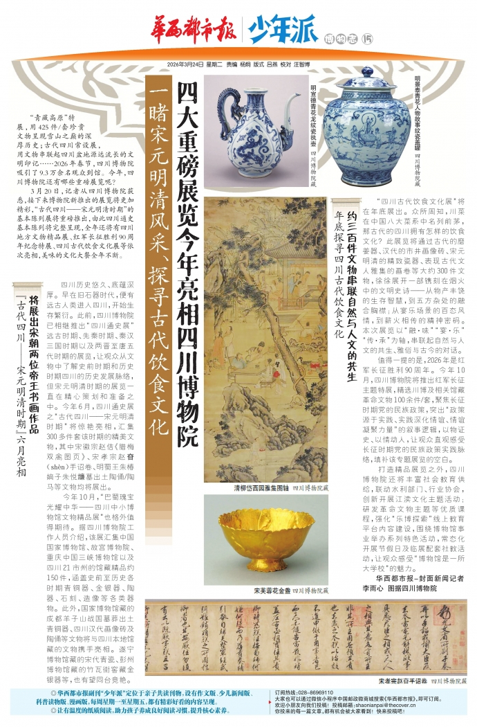 3月20日,记者从四川博物院获悉,接下来博物院新推出的展览将更加精彩,“古代四川——宋元明清时期”的基本陈列展将重磅推出,由此四川通史基本陈列将完整呈现,全年还将有四川地方文物精品展、红军长征胜利90周年纪念特展、四川古代饮食文化展等依次亮相,美味的文化大餐全年不断。