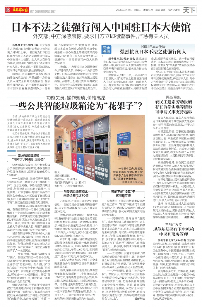 ——功能失灵,维修保养不及时。“垃圾箱几次三番刷卡、扫二维码打不开门,显示无网络。不给地面放传统垃圾箱,智能投放点还总是无法使用,垃圾放哪儿?”在东部沿海城市生活的市民刘女士反映,其小区设置了智慧垃圾箱,但由于常遇网络故障,箱门时常“扫不开”,居民无奈把垃圾放在垃圾箱外。