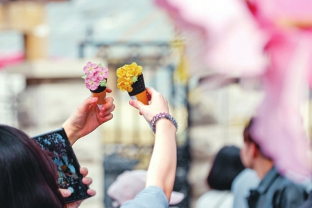 在天津市五大道风景区,游客手举海棠花造型雪糕拍照留影。图据新华社客户端
