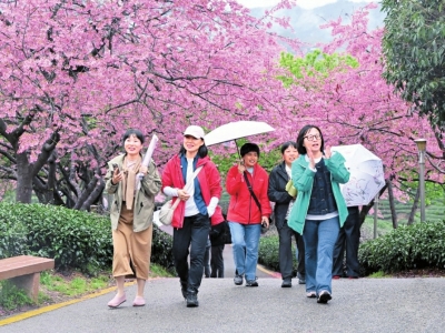 2月28日,游客在福建省漳平市永福镇台品樱花茶园游玩。图据新华社客户端