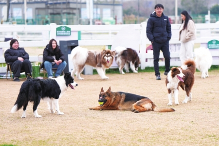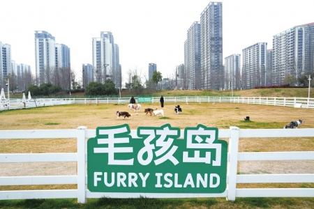 南京市民带着宠物在南京市“毛孩岛”宠物乐园内休闲游玩。