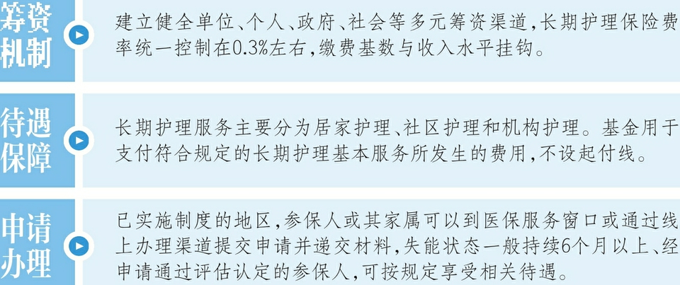 在待遇保障方面,长期护理服务主要分为居家护理、社区护理和机构护理。基金用于支付符合规定的长期护理基本服务所发生的费用,不设起付线。意见还明确了基金支付比例和年度最高支付限额。