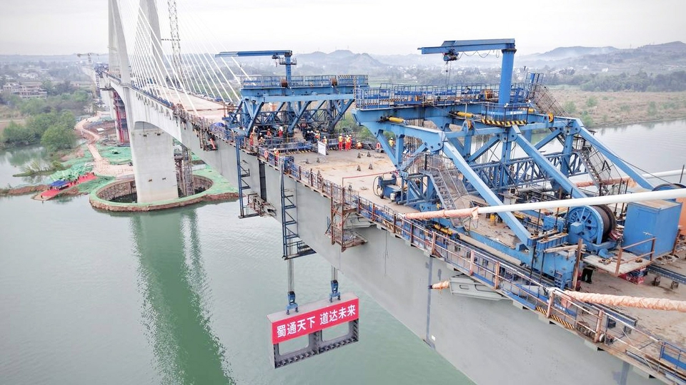 “328米的大跨度为下方嘉陵江留出宽阔的通航空间,矮塔结构在河谷多风的条件下也更稳定。”四川路桥成达万高铁项目常务副指挥长姜林说。